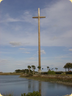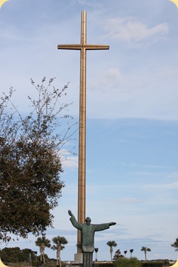 Manuel walks up to the Great Cross, which is made out of sheet metal and is 208 feet tall.